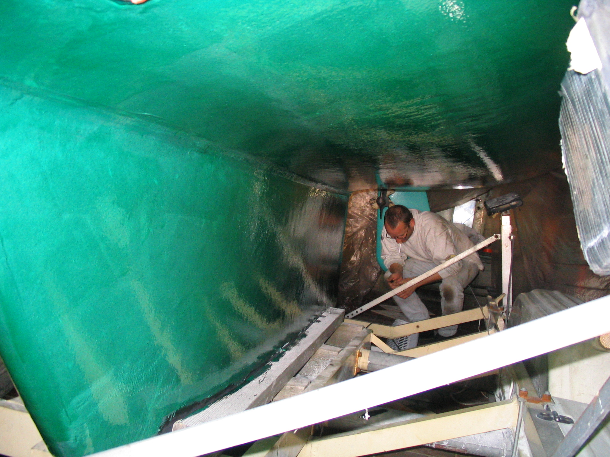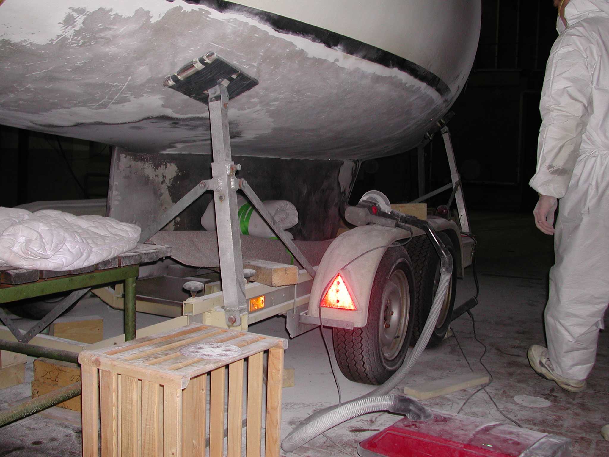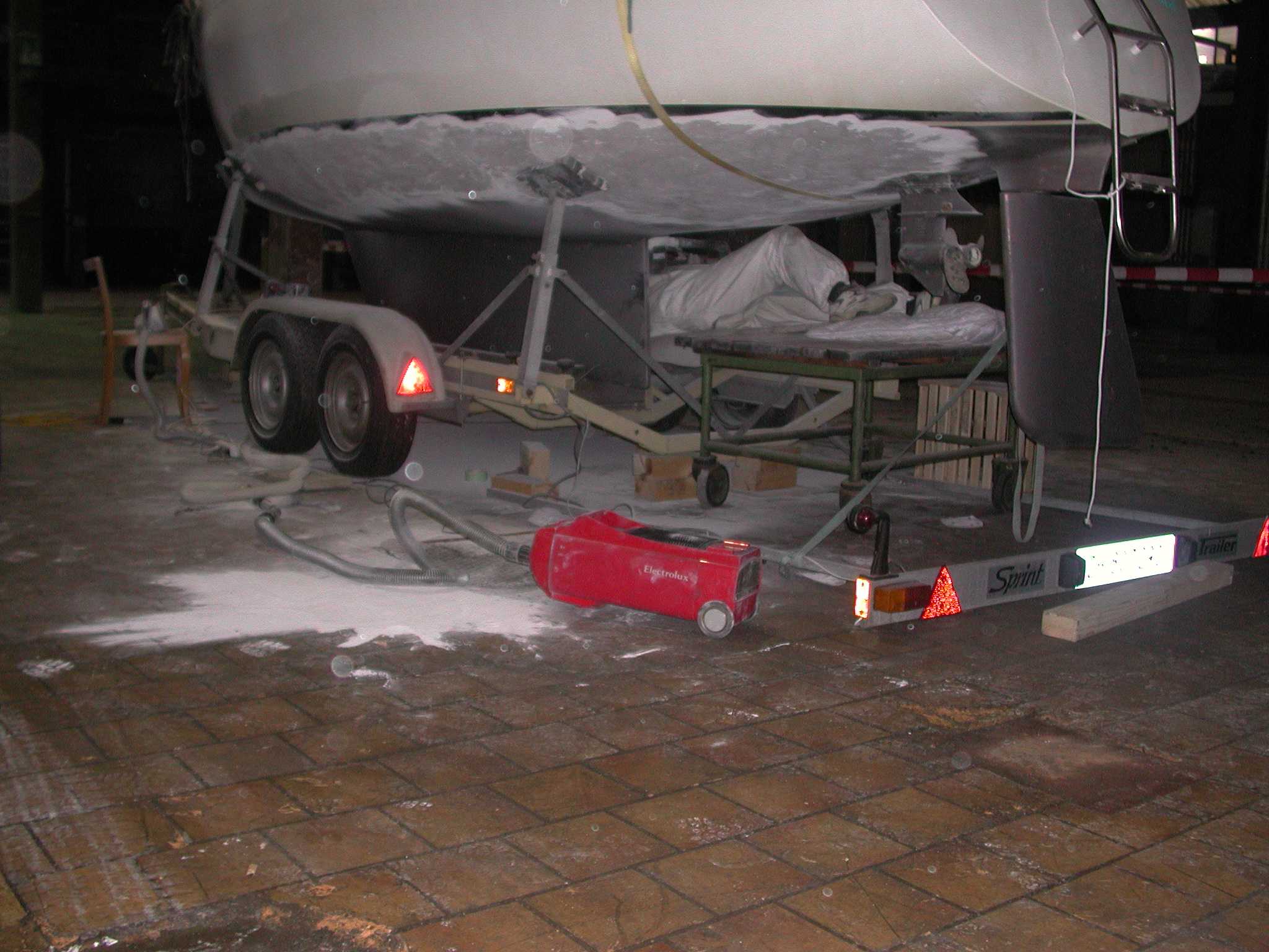 Nach dem Abschleifen habe ich das GFK mit Wasser gründlich abgewaschen und dann etwa 6 Wochen unter gleichzeitiger Verwendung von einigen Heizlüftern austrocknen lassen.