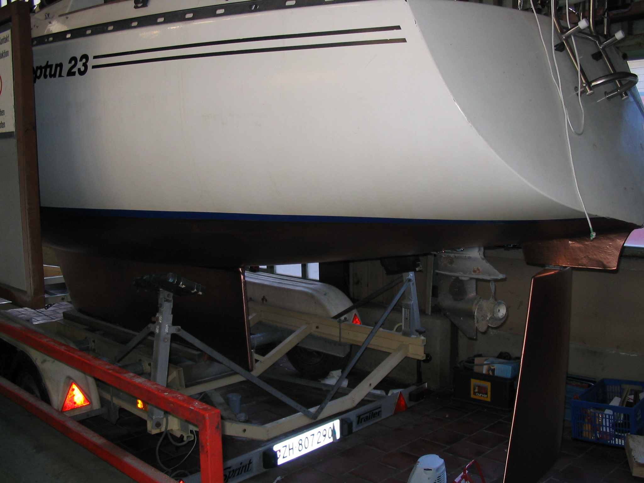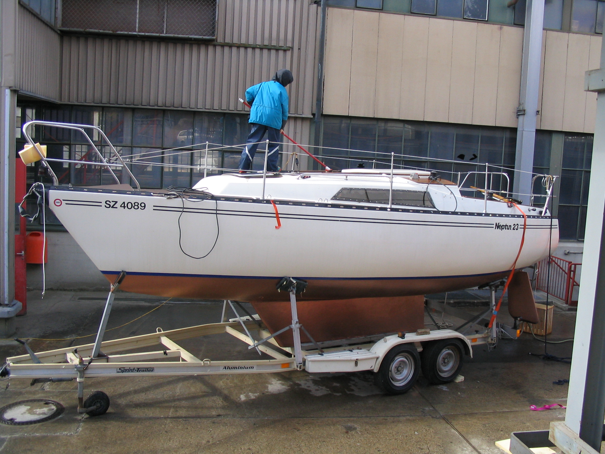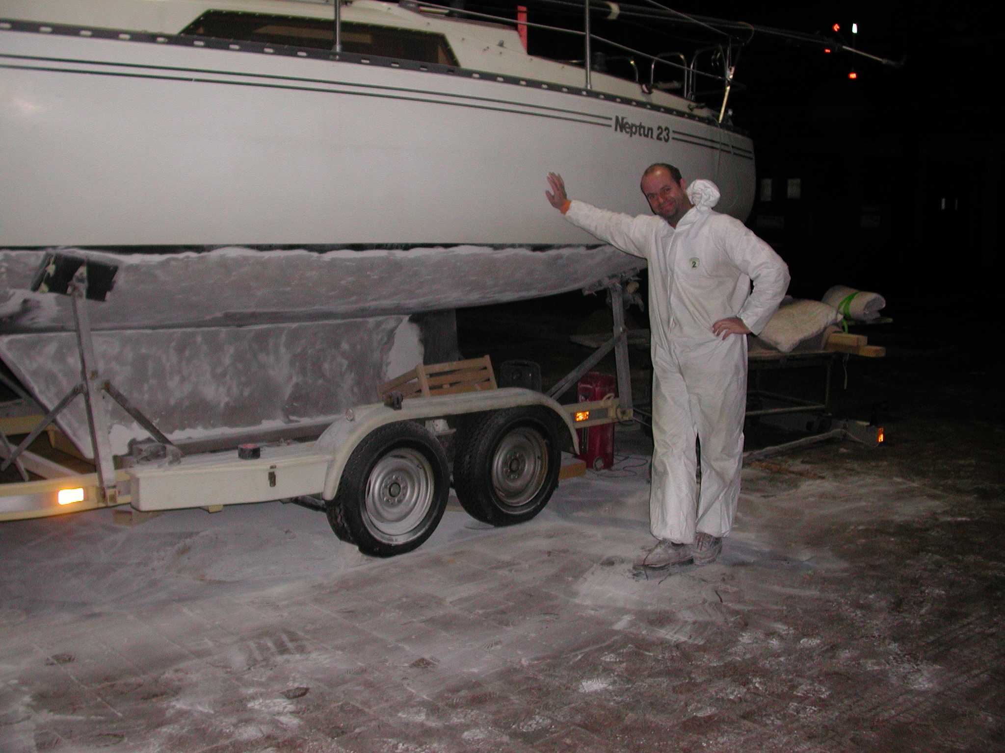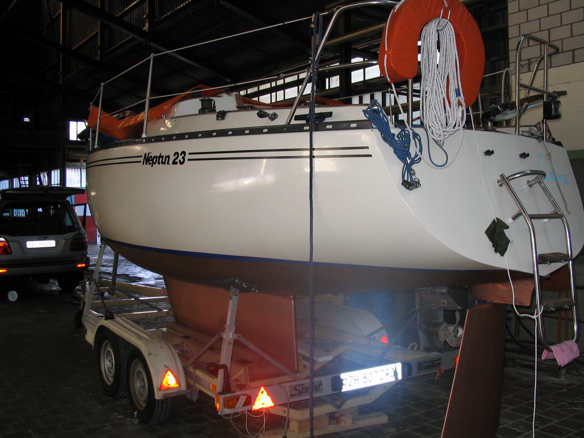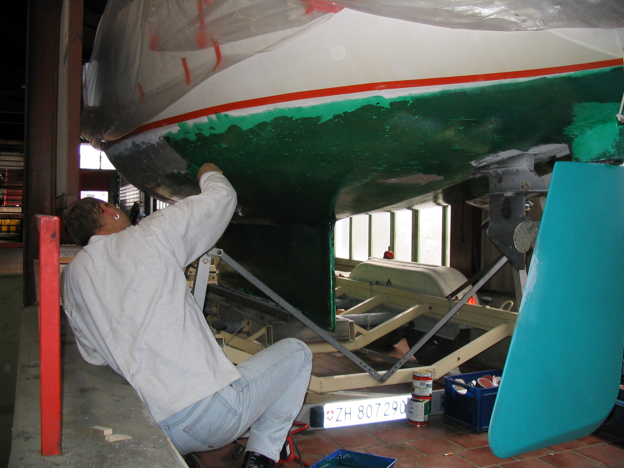 zugegeben, sieht auf dem Foto nicht so toll aus. Aber in real sah es etwas besser aus. Es war zu dieser Zeit auf den Binnenseen der Schweiz oder Deutschland sehr schwierig ein Segelboot zusammen mit einem Liegeplatz zu finden. Bingo! Also habe ich es im November 2002 für 15’000 Franken gekauft, inclusive Trailer und der Berechtigung für einen Hafenplatz. Von einem Mann, der – wie dann mal erfuhr – noch nicht mal einen Segelschein besass. 😉 Interessant. Im Frühjahr 2003 haben wir es geputzt, das Unterwasserschiff angeschliffen und neues Antifouling aufgetragen.