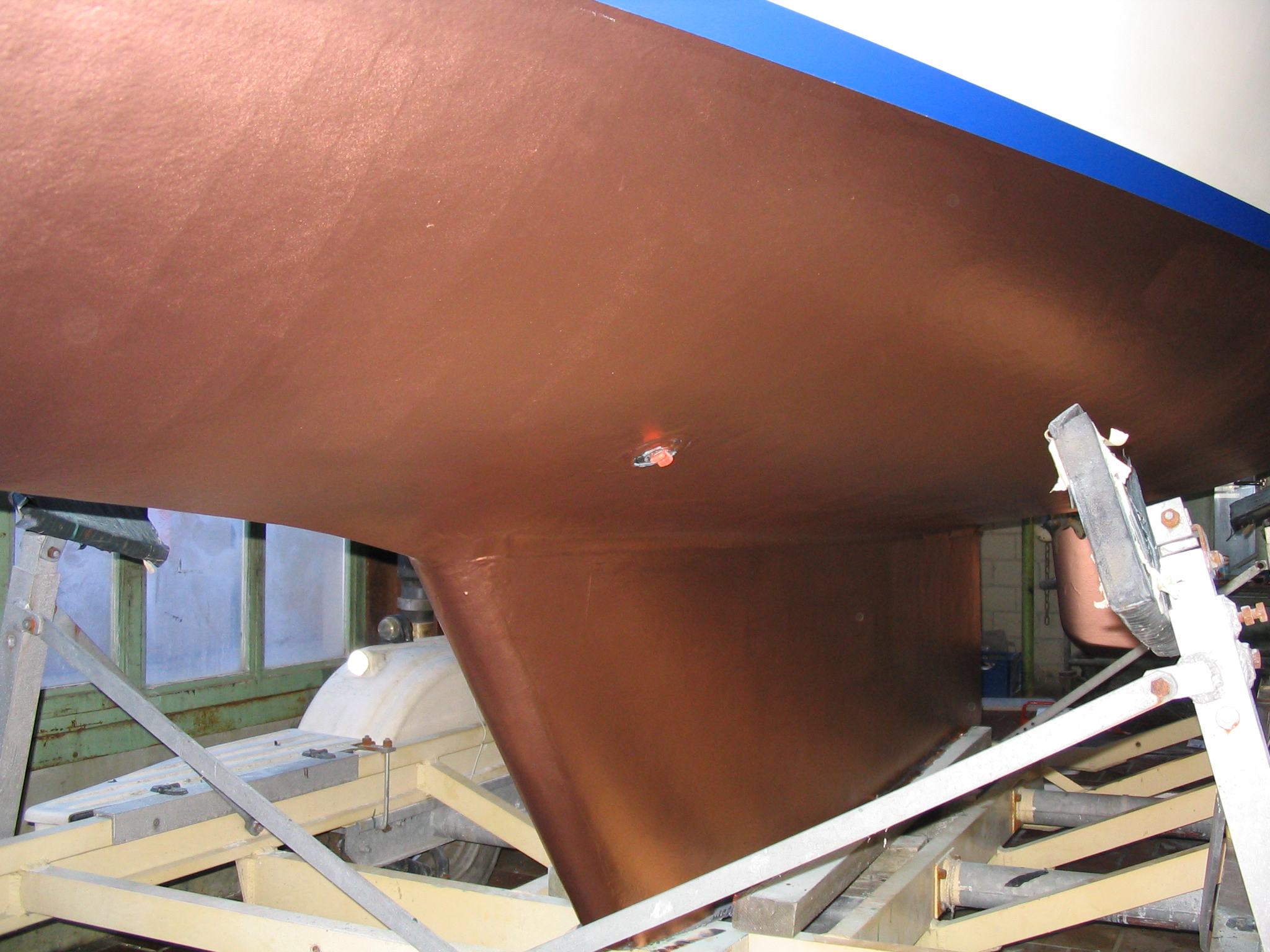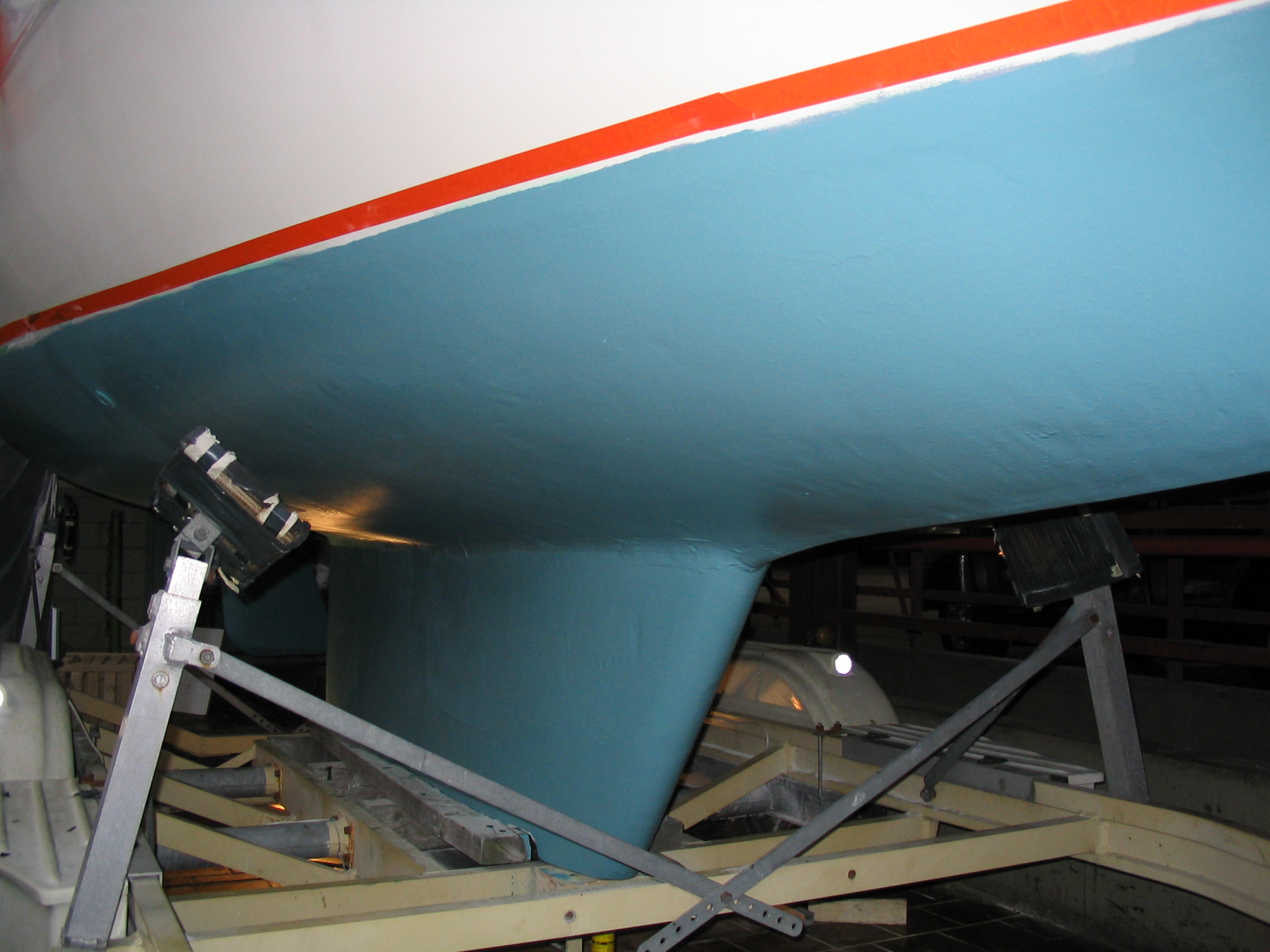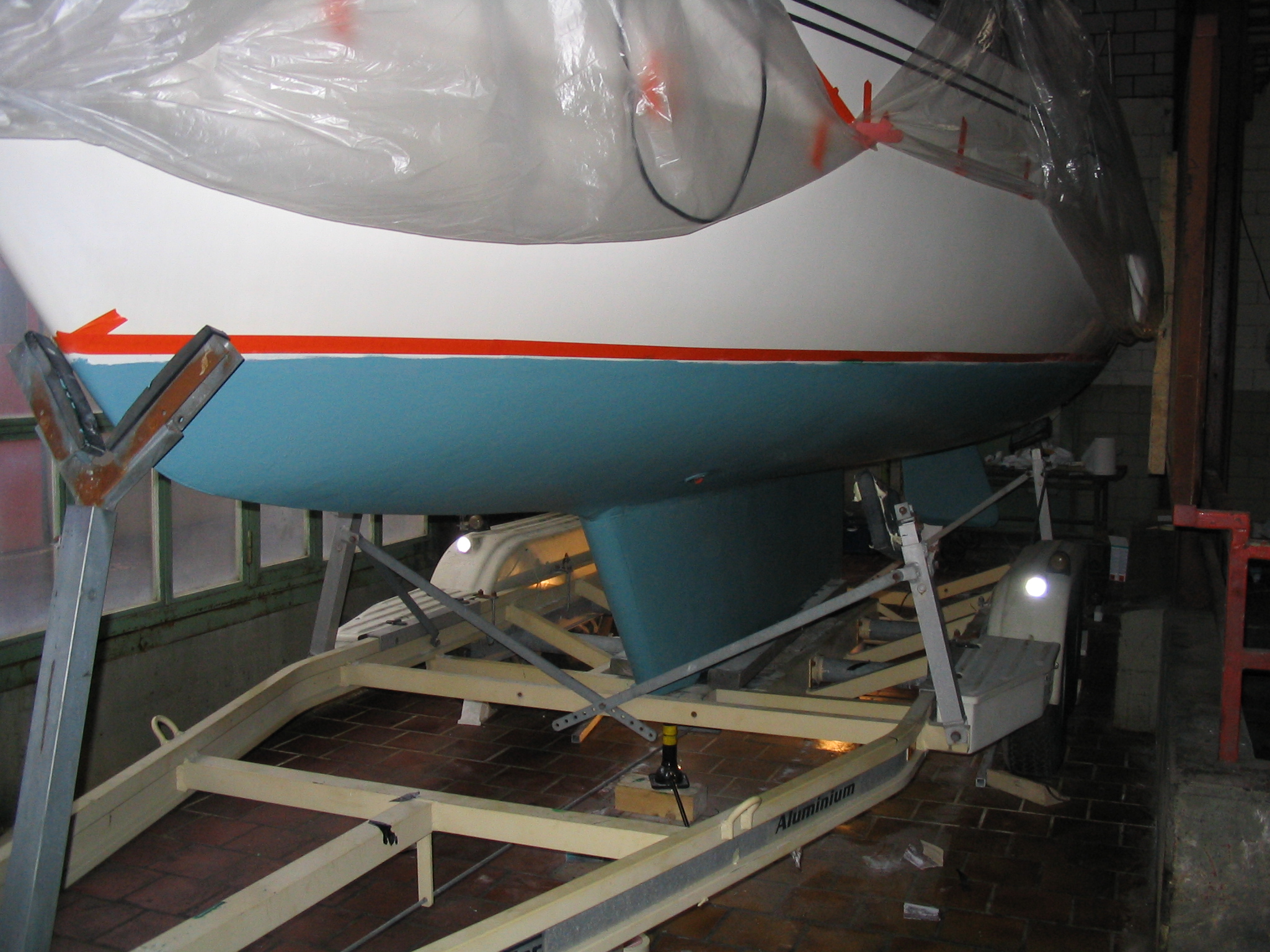 Und am Schluss das Antifouling, International VC17 in diesem Fall. Ohne Werbung machen zu wollen, aber das Zeug ist schon top. Dünn, schnelltrocknend, man muss nicht zwischenschleifen, kann man einfach drüberstreichen.